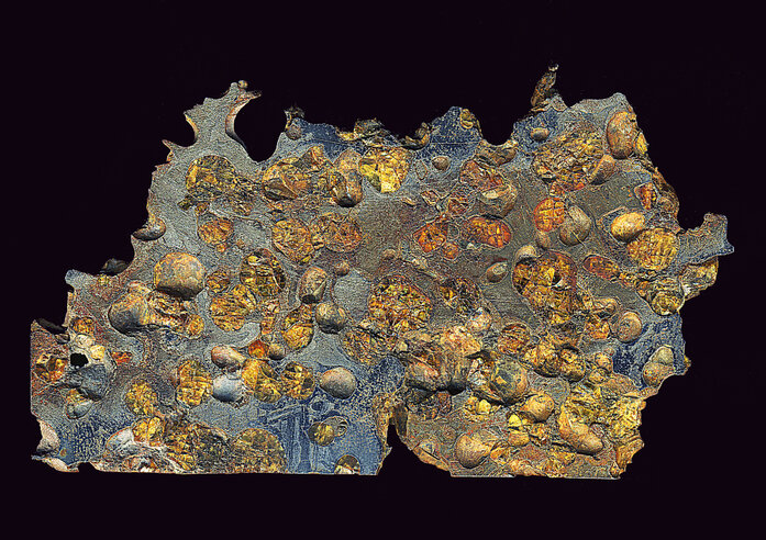 Pallasite gehören zur Gruppe der Stein-Eisen-Meteorite. Sie bestehen aus Olivinkristallen, eingebettet in einer Matrix aus Nickel-Eisen. Benannt wurden die Pallasite nach dem deutschen Naturforscher, Geograph und Entdeckungsreisenden Peter Simon Pallas (1741-1811), der einen heute unter dem Namen „Krasnojarsk“ bekannten Meteoriten während seiner Sibirienreise untersuchte... ( Foto: Joachim Händel)