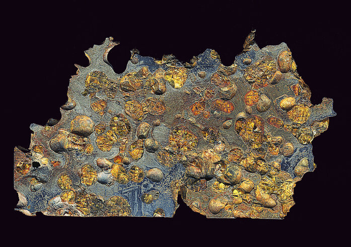 Pallasite gehören zur Gruppe der Stein-Eisen-Meteorite. Sie bestehen aus Olivinkristallen, eingebettet in einer Matrix aus Nickel-Eisen. Benannt wurden die Pallasite nach dem deutschen Naturforscher, Geograph und Entdeckungsreisenden Peter Simon Pallas (1741-1811), der einen heute unter dem Namen „Krasnojarsk“ bekannten Meteoriten untersuchte.... ( Foto: Joachim Händel)