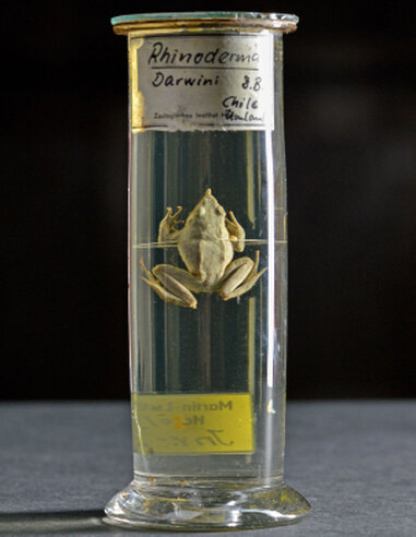 Unter den Flüssigkeitspräparaten des ZNS befindet sich auch Darwins Nasenfrosch (Rhinoderma darwinii). Die ersten Exemplare dieser Art wurden von Charles Darwin während seiner Weltumseglung in den valdivianischen Feuchtwäldern des südlichen Chile gesammelt... (Foto: Markus Scholz)